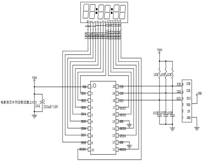 GRID1至GRID6引腳連接到LED顯示屏的位驅(qū)動(dòng)端,用于控制顯示屏的位顯示。