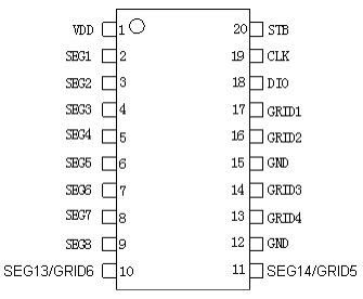 AIP1620芯片采用SOP20封裝,具有20個(gè)引腳,每個(gè)引腳都有明確的功能定義。例如,VDD引腳為邏輯電源輸入,SEG1至SEG8為段輸出引腳,GRID1至GRID6為位輸出引腳,DIO引腳用于串行數(shù)據(jù)輸入/輸出,CLK引腳為時(shí)鐘輸入,STB引腳用于片選和初始化。這些引腳的合理布局和功能設(shè)計(jì),使得AIP1620能夠與外部電路無縫連接,實(shí)現(xiàn)高效的信號(hào)傳輸和控制。
