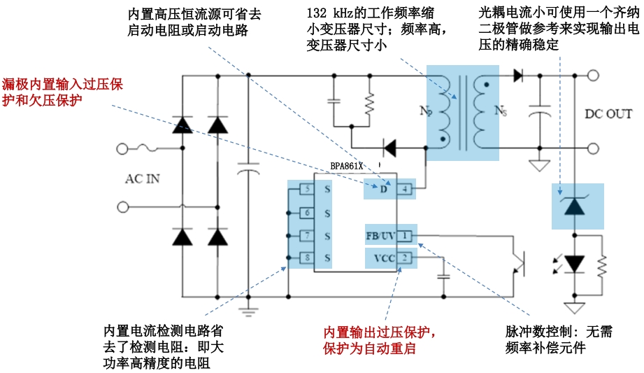 在設計細節上,BPA861X 也展現出了諸多優化之處。它內置了高壓恒流源,可以省去啟動電阻或啟動電路,簡化了外圍電路設計,降低了成本。同時,BPA861X 還內置了電流檢測電路,省去了檢測電阻,這不僅減少了外圍元件數量,還提高了檢測精度和可靠性。相比之下,友商產品在這些方面往往需要額外的外圍元件來實現相同的功能,這不僅增加了設計復雜度和成本,還可能因元件數量的增加而降低系統的可靠性。
