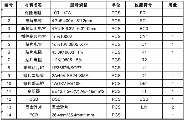 物料清單是實現(xiàn)電路設計的基礎,它詳細列出了電路中所使用的各種元件及其規(guī)格型號。在 LP3667B 5V1A 充電器的 BOM 表中,涵蓋了保險電阻、電解電容、高頻低阻電容、瓷片電容、貼片電阻、集成貼片 IC、貼片二極管、貼片整流橋、變壓器、USB 接口、五金彈片以及 PCB 等多種元件。例如,保險電阻采用 10R 1/2W 的規(guī)格,用于電路的過流保護;電解電容選用 4.7uF 400V 的型號,用于輸入濾波;高頻低阻電容則采用 470uF 6.3V 的規(guī)格,用于輸出濾波,以降低輸出紋波。這些元件的合理選型和搭配,共同構成了一個高效、穩(wěn)定的充電器電路。