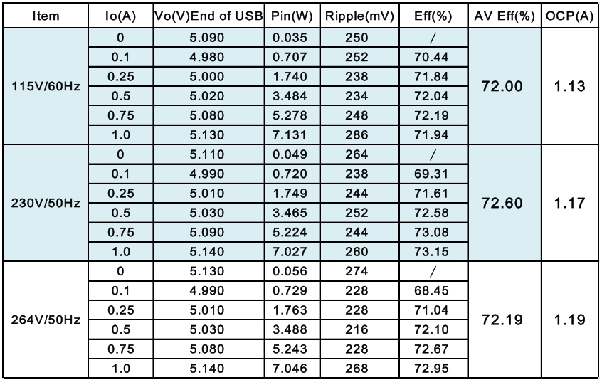 效率是衡量充電器性能的重要指標之一。根據測試數(shù)據,在不同輸入電壓和負載條件下,該充電器的效率表現(xiàn)較為出色。例如,在輸入電壓為 115Vac/60Hz 時,滿載效率達到 72.00%;而在輸入電壓為 230Vac/50Hz 時,滿載效率為 72.60%。這表明充電器在不同工作條件下都能保持較高的轉換效率,減少了能量損耗,提高了能源利用率。