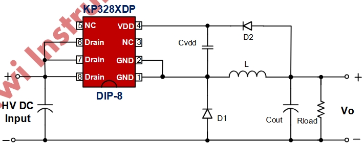 在該電路中,HV DC Input為高壓直流輸入端,Vo為輸出電壓端,Drain為內部高壓MOSFET的漏極,GND為參考地。Cvdd為VDD腳的濾波電容,推薦采用1uF陶瓷電容;L為電感,用于儲能和濾波;D1和D2為二極管,用于整流和續(xù)流;Cout為輸出濾波電容,用于平滑輸出電壓;Rload為負載電阻,代表實際應用中的負載設備。