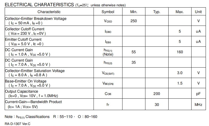 集電極 - 發(fā)射極飽和電壓(VCE(SAT)):在集電極電流為8.0A,基極電流為0.8A時,VCE(SAT)的最大值為3.0V。較低的飽和電壓意味著在晶體管導(dǎo)通時,能量損耗較小,從而提高了功率放大器的效率。