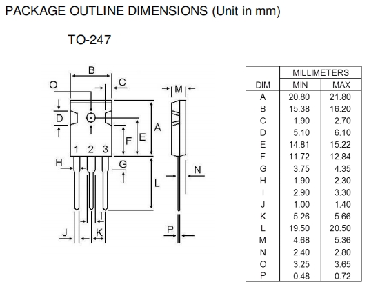 2SA1943采用了TO-247封裝形式,這種封裝形式具有良好的散熱性能和較高的電流承載能力。TO-247封裝通常包括一個較大的集電極引腳,用于連接散熱器,從而能夠有效地將晶體管工作時產(chǎn)生的熱量散發(fā)出去,確保晶體管在高功率工作時的穩(wěn)定性。其封裝尺寸為20.80mm×16.20mm×5.38mm,這種尺寸使得它能夠方便地安裝在各種電路板上,并且可以與其他電子元件進(jìn)行良好的配合。