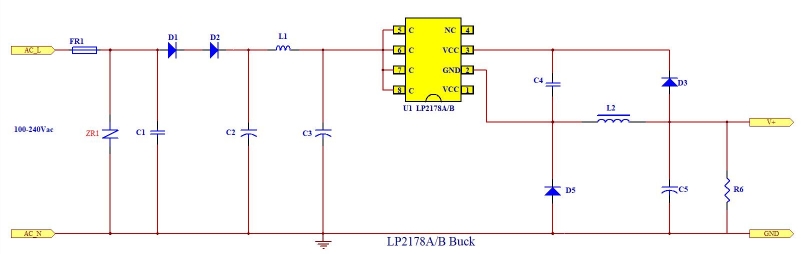 變壓器通過(guò)電磁感應(yīng)將輸入的高電壓轉(zhuǎn)換為適合降壓轉(zhuǎn)換器處理的低電壓。在本方案中,變壓器將整流后的直流電壓轉(zhuǎn)換為適合LP2178B芯片處理的電壓水平,從而實(shí)現(xiàn)高效的降壓轉(zhuǎn)換。