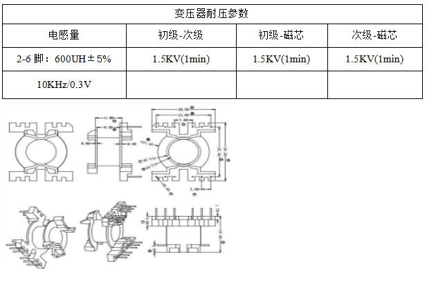 電感量LP 600 μH ±5 %,漏感<30 μH(5 %),氣隙0.15 mm(PC40材質(zhì),研磨中間柱)