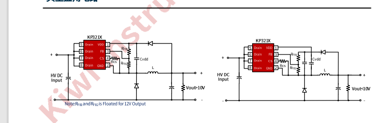 KP321X 集成有完備的帶自恢復功能的保護功能: VDD 欠壓保護、逐周期電流限制、輸出過壓保護、過熱保護、過載保護和 VDD 過壓保護等。