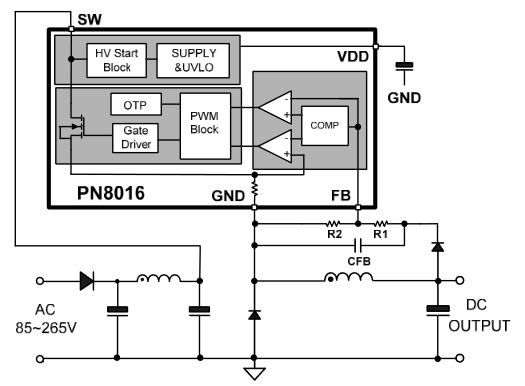 PN8016SSC-R1B集成PFM控制器及800V高雪崩能力智能功率MOSFET,用于外部元器件極精簡的小功率非隔離開關(guān)電源,輸出電壓可通過FB電阻調(diào)整。PN8016內(nèi)置800V高壓啟動與自供電模塊,實現(xiàn)系統(tǒng)快速啟動、超低待機、自供電功能。該芯片提供了完整的智能化保護(hù)功能,包括過載保護(hù),欠壓保護(hù),過溫保護(hù)。另外PN8016的降頻調(diào)制技術(shù)有助于改善EMI特性。