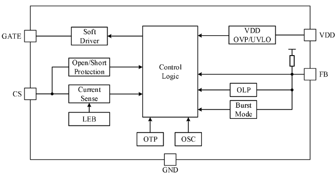 芯片通過對輸出采樣并反饋到光耦獲得高精度的恒壓輸出。內(nèi)置的斜率補償電路確保了峰值電流模控制的穩(wěn)定性。內(nèi)部集成的頻率抖動功能可以改善EMC,降低EMI濾波成本。