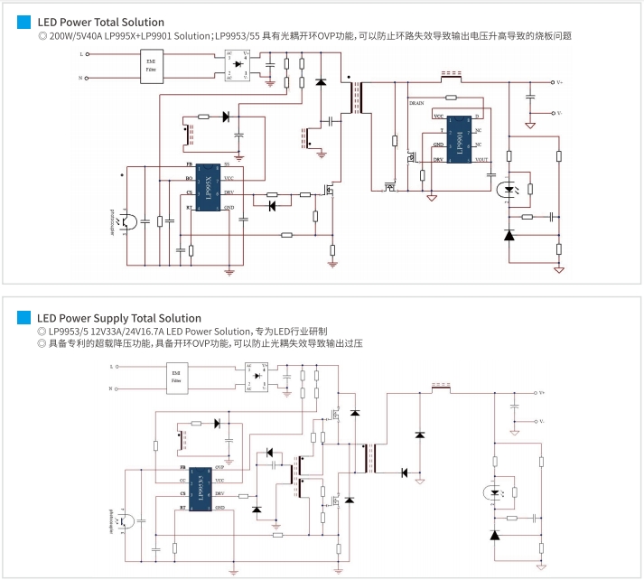 對于100~200W的LED照明系統,推薦使用LP9952/53或LP9955/56作為PWM控制器,以及LP9901/LP9911作為SR控制器。這種配置提供了開環限壓功能,確保了高可靠性和低成本。推薦的電壓配置為5V40A,足以滿足中等功率LED燈具的需求。