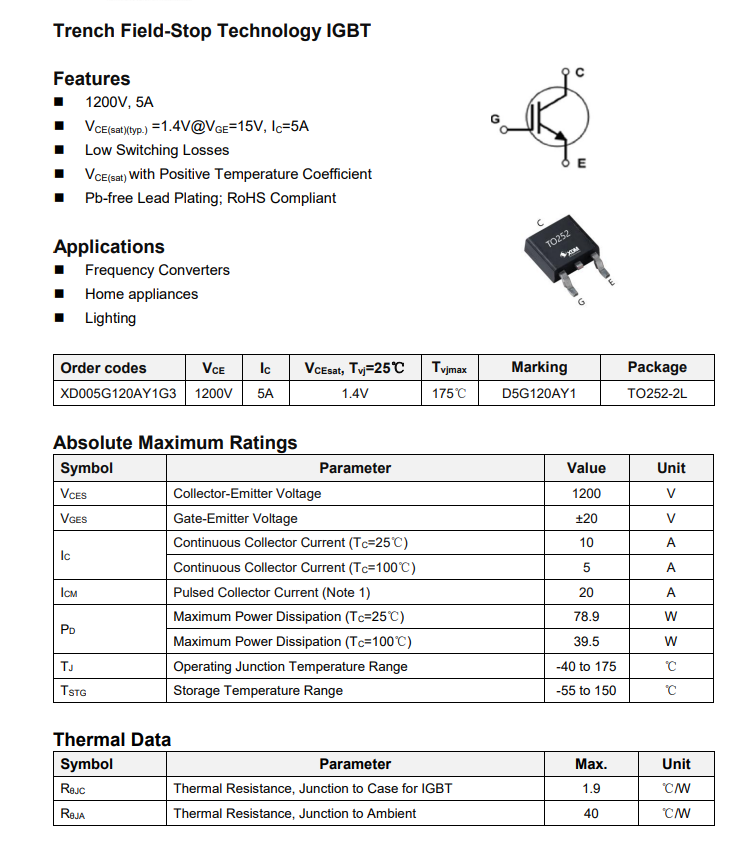 XD005G120AY1G3 國(guó)產(chǎn)IGBT 芯達(dá)茂 5A 1200V TO-252-3L