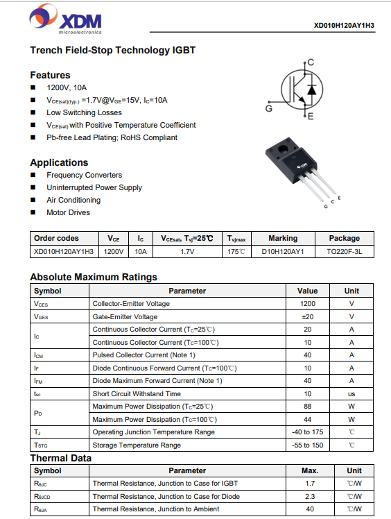 XD010H120AY1H3 國產IBGT 芯達茂 10A 1200V TO-220F-3L