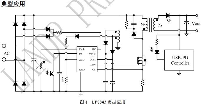 LP8843推薦應用功率為36W至150W,這覆蓋了從小型個人電子設備到較大功率需求的電子設備的廣泛應用。其高效率的電源管理能力,使其在PD快充和AC-DC適配器等領域中表現出色。